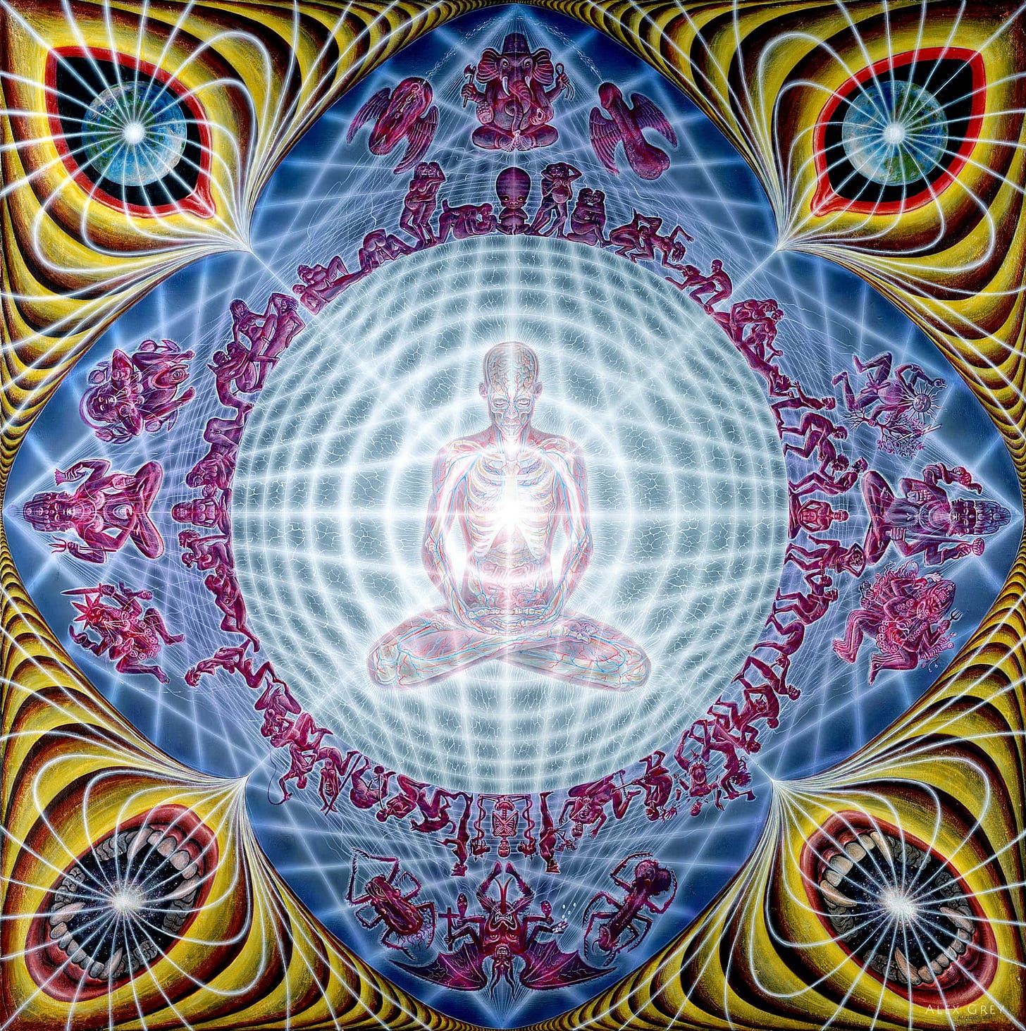 Alex Grey’s painting “Deities and Demons Drinking from the Milky Pool” (1987, acrylic on linen) stems from a profound visionary experience he had during a group psychedelic session. Grey described the vision as follows: